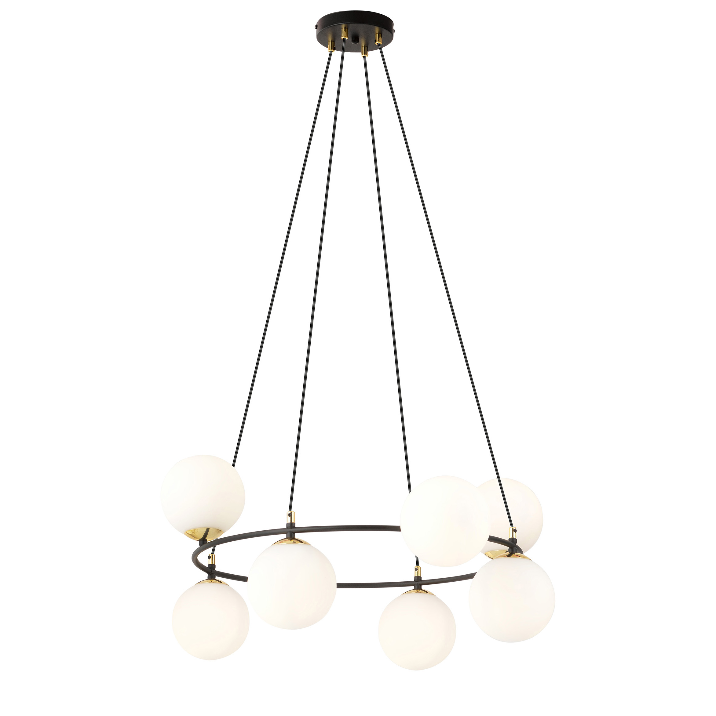 • Bringen Sie mit der Akuryon Pendelleuchte die Eleganz des minimalistischen Designs in Ihr Interieur. Sie ist aus schwarzem Stahl gefertigt und ergänzt sich perfekt mit dem gläsernen Schirm. Die Lampe in Form eines Kreises mit unregelmäßig verteilten Schirmen verleiht dem Raum eine einzigartige Atmosphäre und unterstreicht seinen modernen und anspruchsvollen Charakter. Diese Leuchte ist eine ausgezeichnete Wahl für alle, die ihrem Raum Originalität verleihen und eine funktionelle und ästhetische Beleuchtung schaffen wollen.