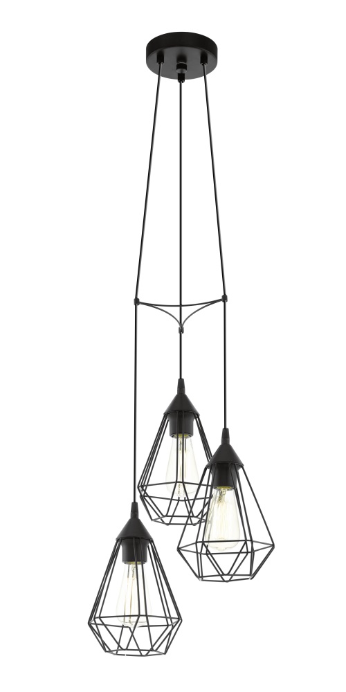• Elegante Hängeleuchte Tarbes von Eglo bestehend aus einer runden in schwarz gehaltenen Stahlhalterung mit drei aus Stahl bestehenden Lampenschirmen ebenfalls in schwarz