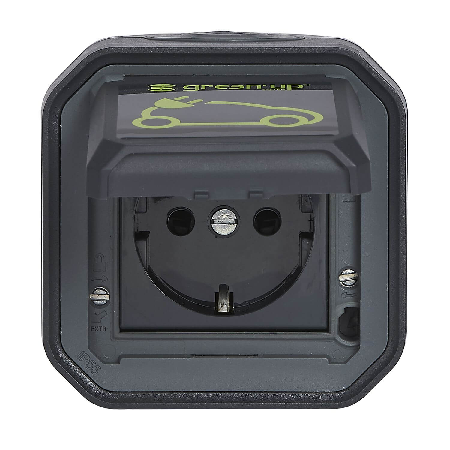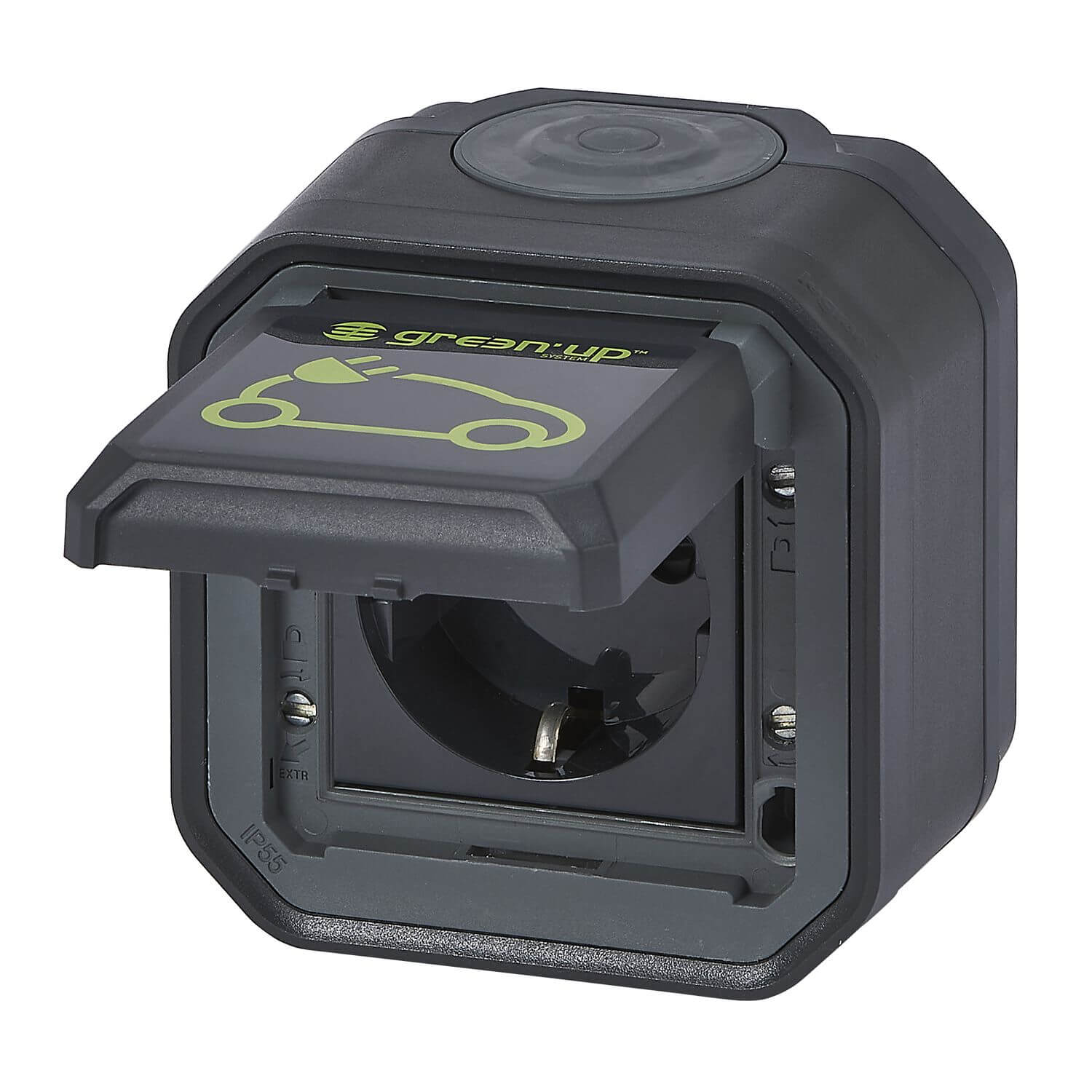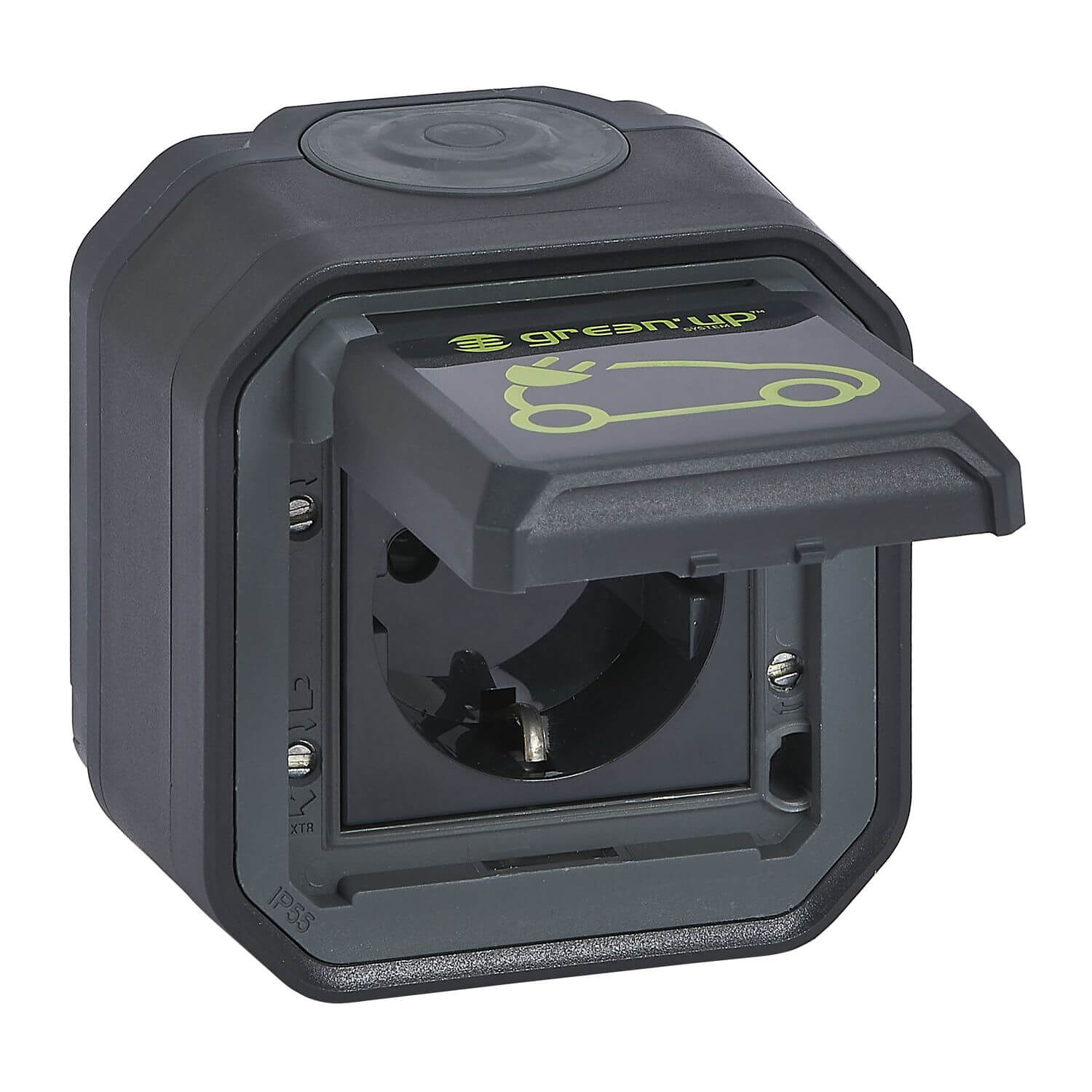 • Legrand Plexo New Feuchtraum-AP-EV-Steckdose, Aufladen von Elektrofahrzeugen, IP55 - IK08, 230V, 16A, autom. Anschlüsse, Schutzkontakt-Standard, integr. Klappdeckel E-Auto-Markierung, anthrazit, 069708L