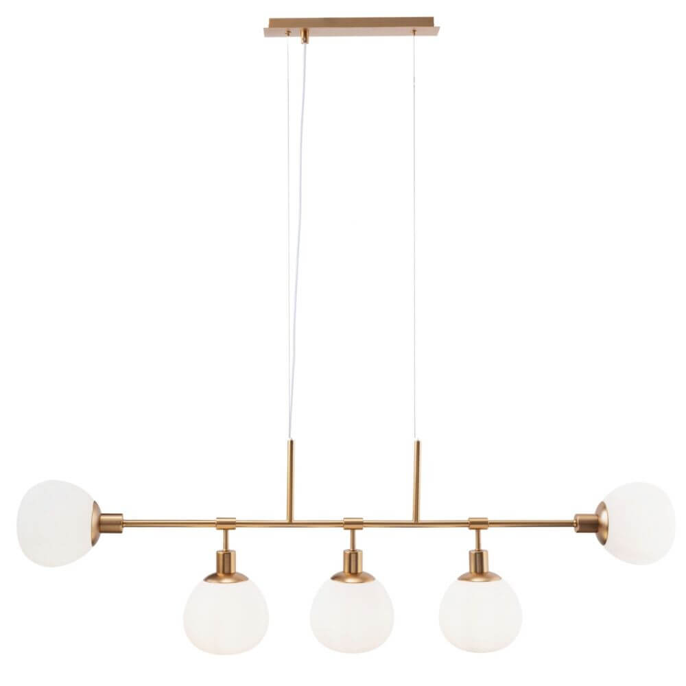 Materialien & Maße Farbe: Messing Material: Metall Höhe: 373 mm Breite: 1200 mm Tiefe: 150 mm Minimum Leuchtenhöhe abgehängt: 453 mm Maximum Leuchtenhöhe abgehängt: 1493 mm Lampenschirm Material: Glas Lampenschirm Farbe: Weiss Lampenschirm Durchmesser: 150 mm