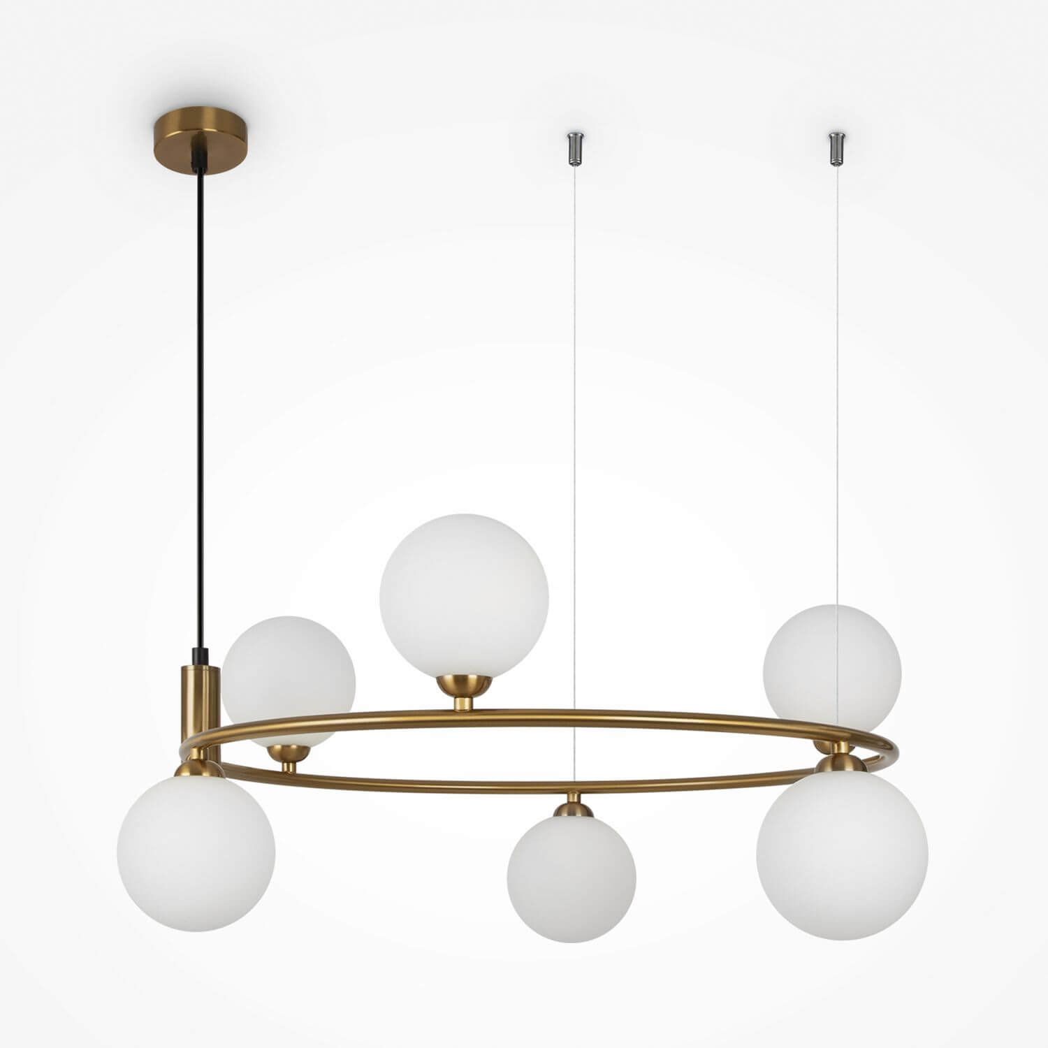 Materialien & Maße Farbe: Messing Material: Metall Höhe: 28 cm Breite: 58 cm Tiefe: 65 cm Durchmesser: 58 cm Minimum Leuchtenhöhe abgehängt: 28 cm Maximum Leuchtenhöhe abgehängt: 178 cm Lampenschirm Material: Glas Lampenschirm Farbe: Weiss Lampenschirm Höhe: 12 cm